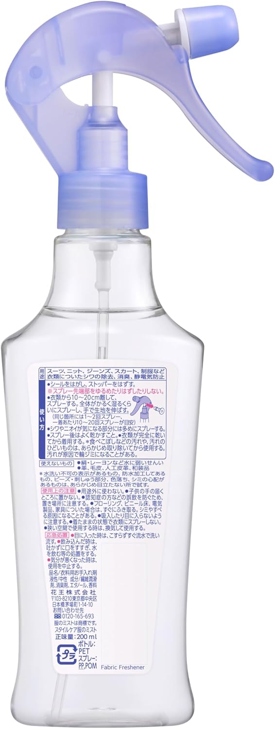 Kao Style Care Styling Agent for Clothing Mist არის ინოვაციური ტანსაცმლის მოვლის სპრეი, რომელიც დაგეხმარებათ იდეალური იერის შენარჩუნებაში მთელი დღის განმავლობაში. პროდუქტი სპეციალურად შექმნილია იმისთვის, რომ გაასწოროს ნაკეცები ტანსაცმელზე, გაანეიტრალოს უსიამოვნო სურნელი და დატოვოს მსუბუქი, სუფთა არომატი.