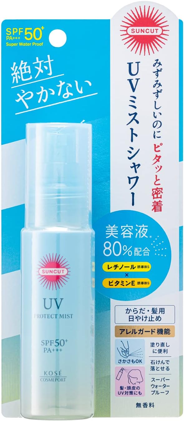 Kose Suncut UV Protect Spray SPF50+ PA++++ არის უნივერსალური მზისგან დამცავი სპრეი, რომელიც უზრუნველყოფს მაქსიმალურ დაცვას მავნე ულტრაიისფერი სხივებისგან. მისი ძლიერი SPF50+ PA++++ ფორმულა ბლოკავს UVA და UVB სხივებს, რაც ხელს უშლის თმის, თავის კანისა და სხეულის გამოშრობას, ფერის შეცვლასა და ფოტოდაბერებას.