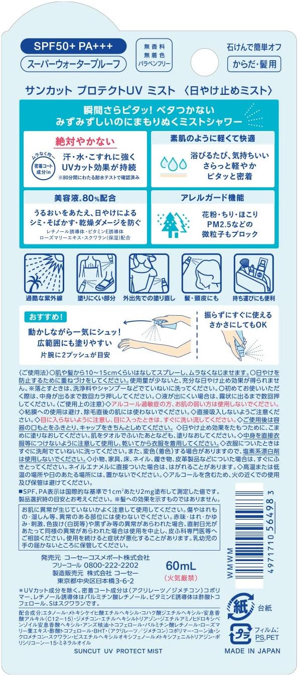 👉 თუ ეძებთ მრავალფუნქციურ და პრაქტიკულ მზისგან დამცავ საშუალებას, Kose Suncut UV Protect Spray SPF50+ PA++++ იქნება თქვენი სანდო დამცველი ზაფხულშიც და მთელი წლის განმავლობაში.