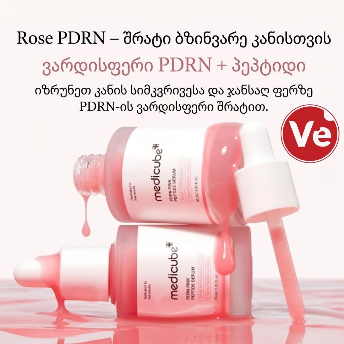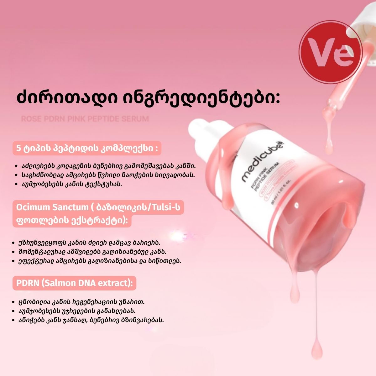 - ვარდისფერი ბზინვარება (Pink Glow): შრატს აქვს ბუნებრივი ვარდისფერი ტონი (ვიტამინ B12-ის წყალობით), რომელიც მომენტალურად აცოცხლებს დაღლილ კანს და ანიჭებს მას ე.წ. “Glass Skin” ეფექტს.