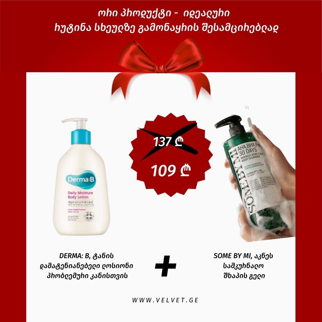 DERMA: B, DAILY MOISTURE BODY LOTION მსუბუქი, სწრაფად შეწოვადი ლოსიონი, რომელიც უზრუნველყოფს კანის ღრმა დატენიანებასა და დარბილებას მთელი დღის განმავლობაში. მისი უნიკალური ფორმულა Clinically Proven Technology™-ით ინარჩუნებს ტენიანობას 48 საათის განმავლობაში და აძლევს კანს ჯანსაღ, გლუვ იერს.